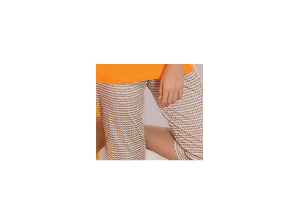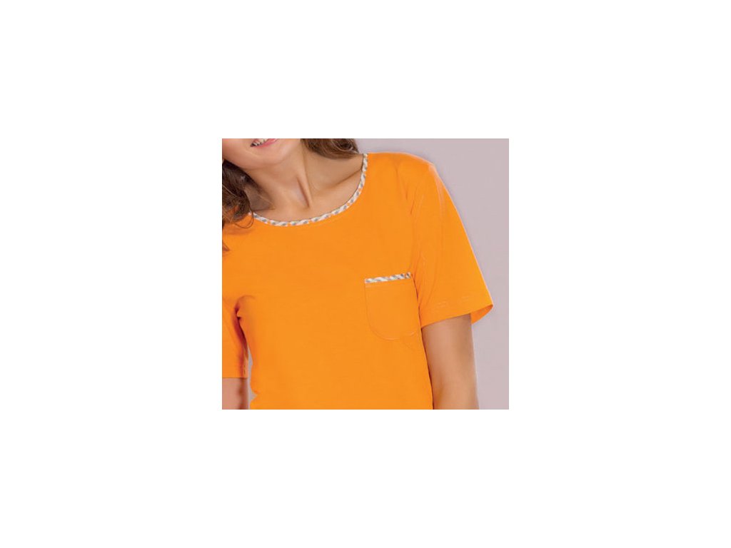 Svěží dámské pyžamo od firmy LUNA, skládající se z vrchního dílu s krátkým rukávem a capri kalhot o 3/4 délce. Vrchní díl má lemování v barvě kalhot a kapsičku.