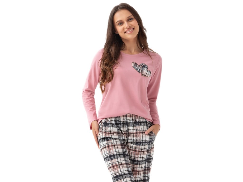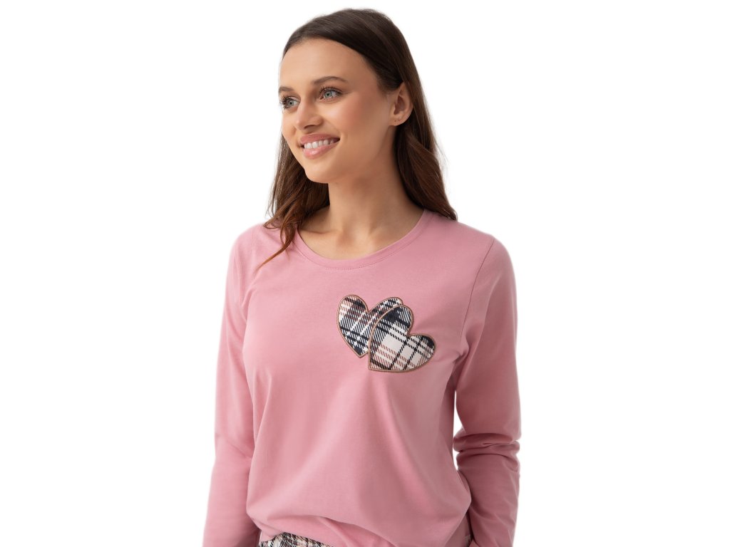 Vrchní část pyžama je zdobena decentní růžovou halenkou s dlouhým rukávem zdobenou aplikací kostkovaného srdce – něžným detailem, který dodává pyžamu ženský nádech.