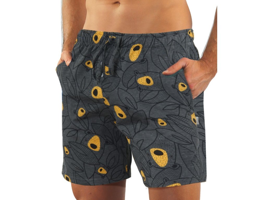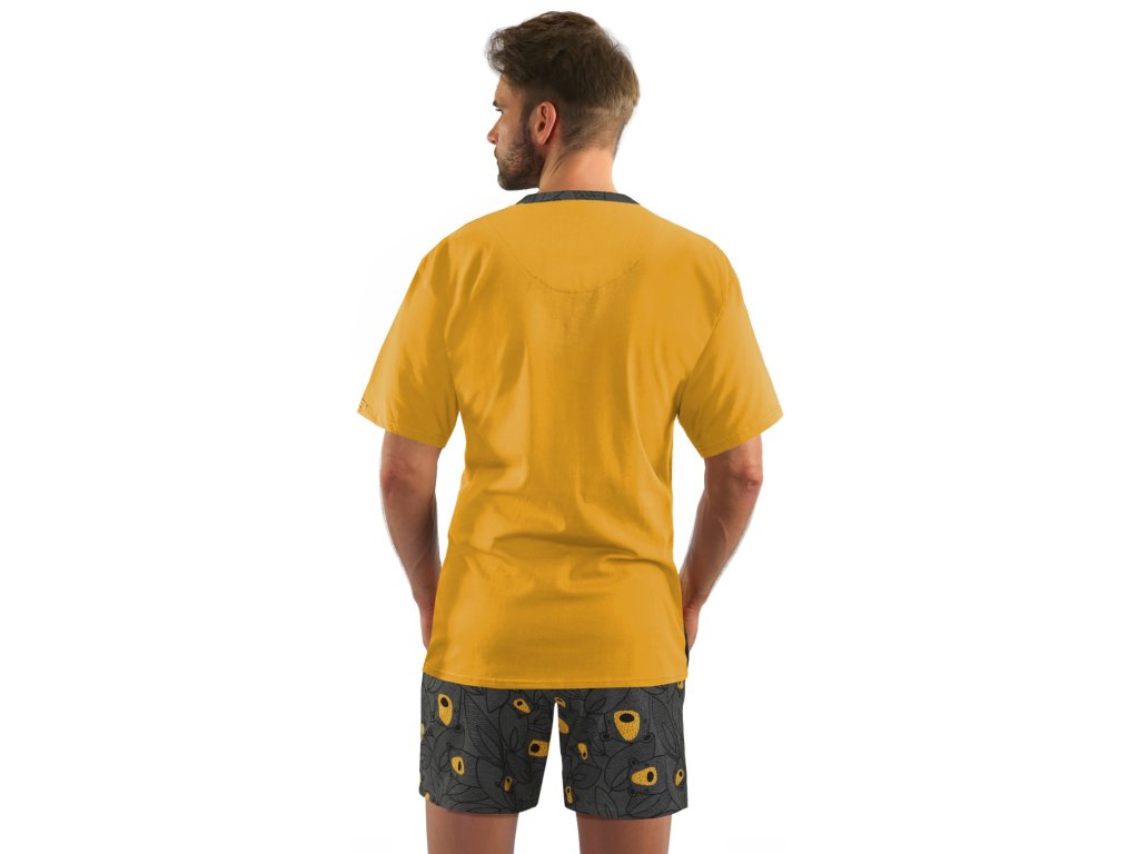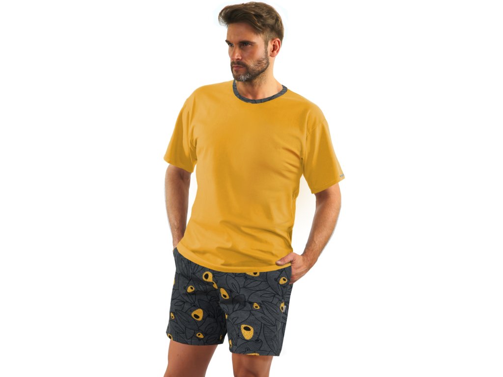 Mladistvé a módní pánské pyžamo od Sesto Senso s krátkými rukávy a šortkami. Jednobarevný top je kombinovaný s kraťasy s motivem medvědů. Půlkruhový výstřih je obšitý paspulí. Šortky mají široký elastický pas, přídavnou šňůrku, poklopec na dva knoflíky a pohodlné kapsy na bocích.