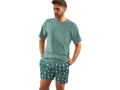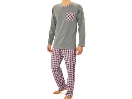 Pánské pyžamo skládající se z trička se šedými pruhy a jednobarevných kalhot.