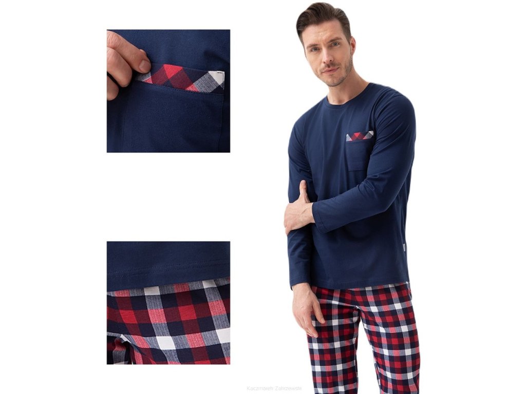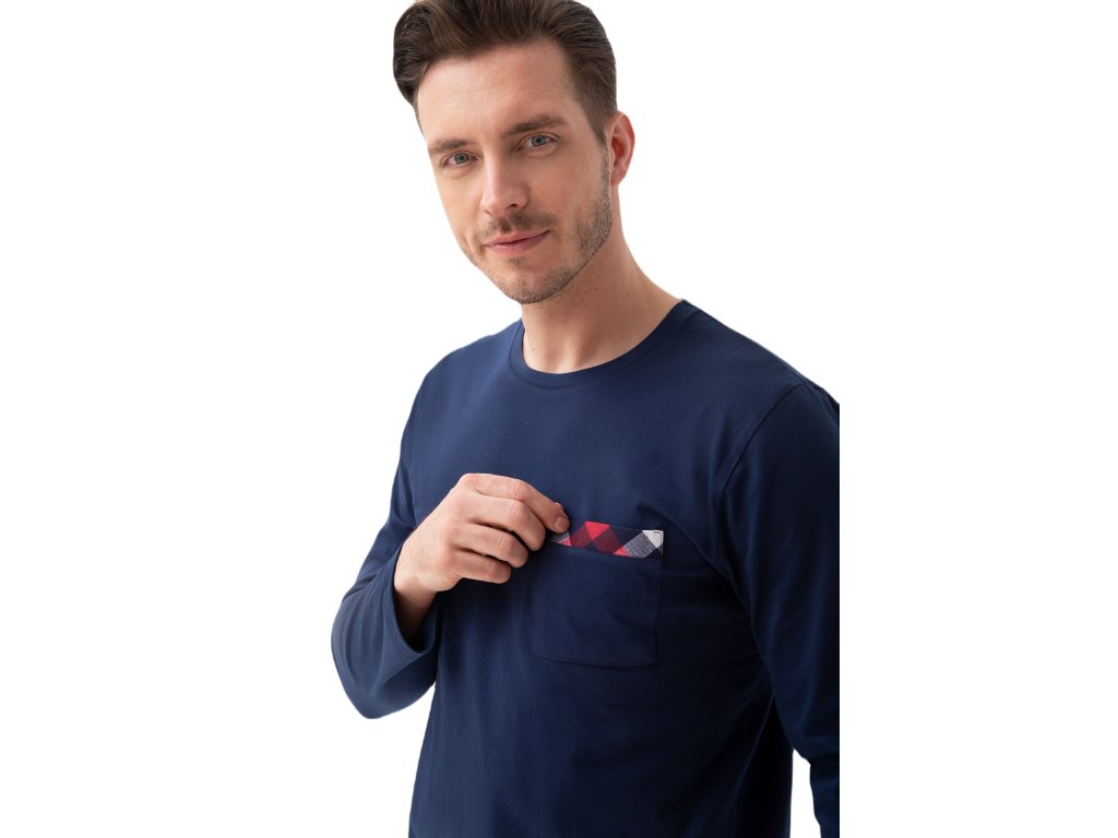 Tmavě modrý pyžamový top má dlouhé rukávy a náprsní kapsu a půlkulatý výstřih.