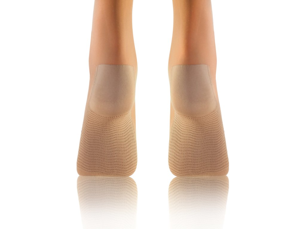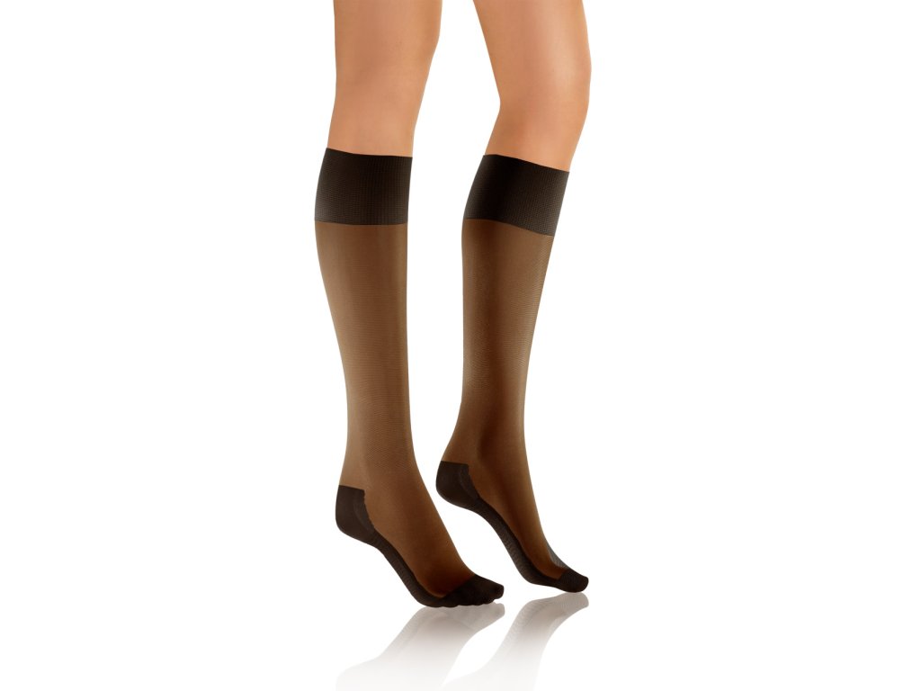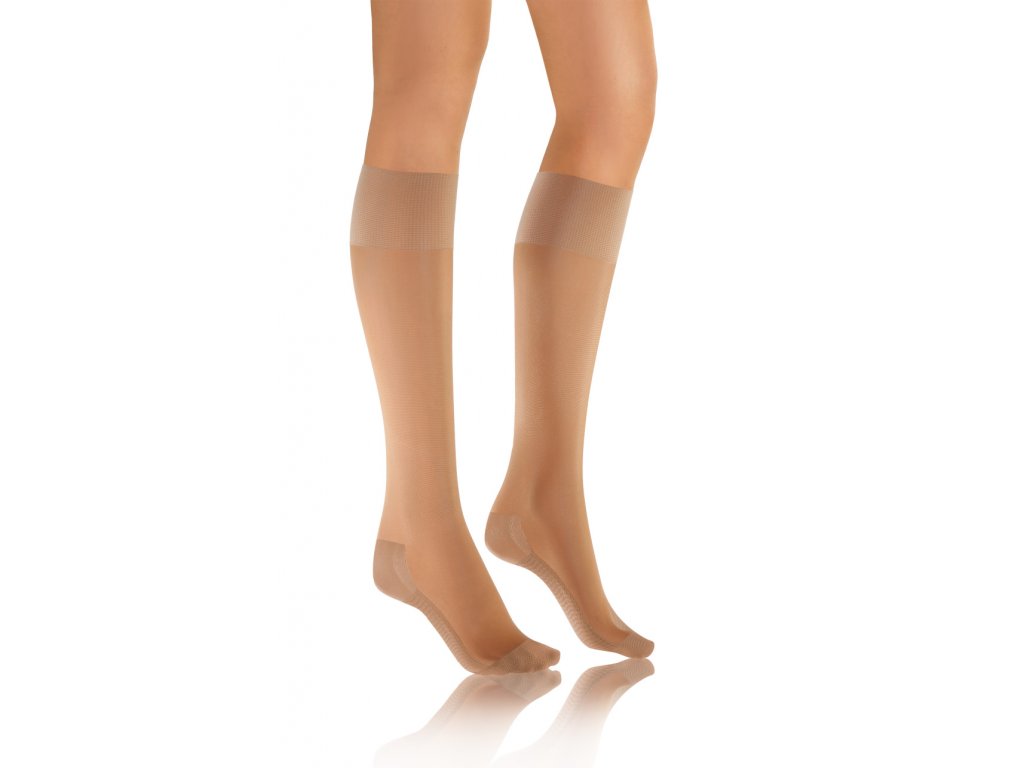 Podkolenky s profylaktickým efektem masáže chodidel a beztlakovým lemem. Polomatné a průhledné.